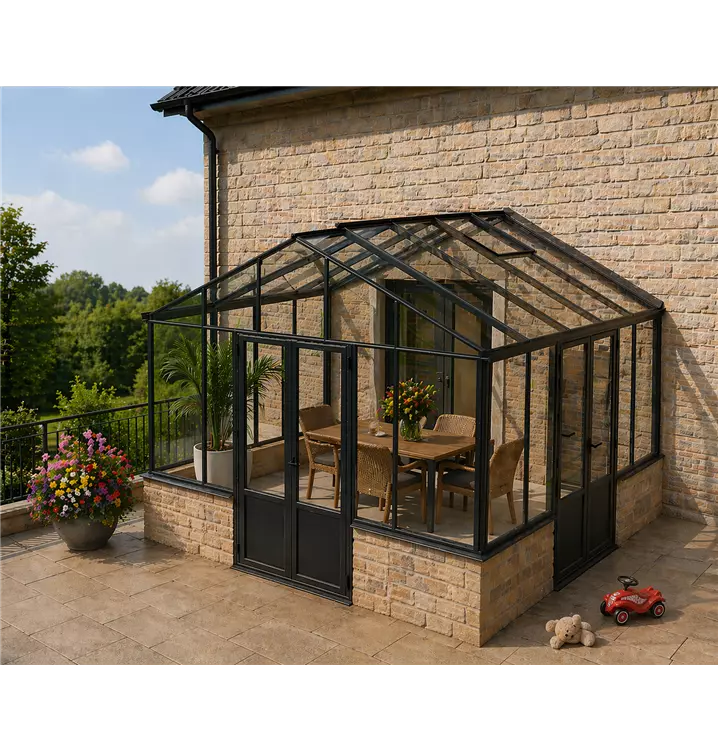 Anlehngewächshaus Euro-Plus, Breite ab 3,80 m, Länge 3,80 m, 4 mm ESG Sicherheitsglas in Dach und Wand. Zwei Doppel-Flügeltüren und ein Schiebefenster sorgen für ein gutes Klima auch im Sommer.
