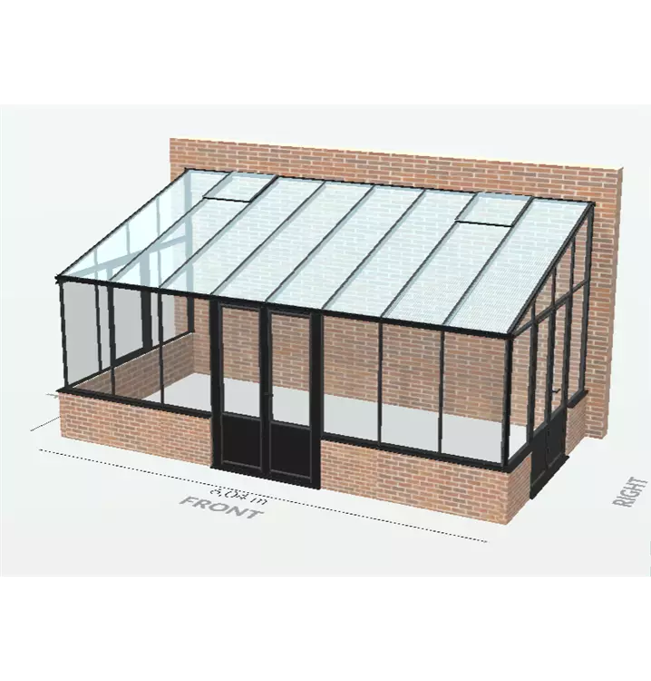 Das Anlehn-Gewächshaus Muurserre ist in der Breite von 2,33 m und 3,08 m und einer Länge von 2,36 m bis 9,02 m konfigurierbar. Es können auf allen Seiten weitere Türen oder Fenster geplant werden. Fragen Sie uns gerne!