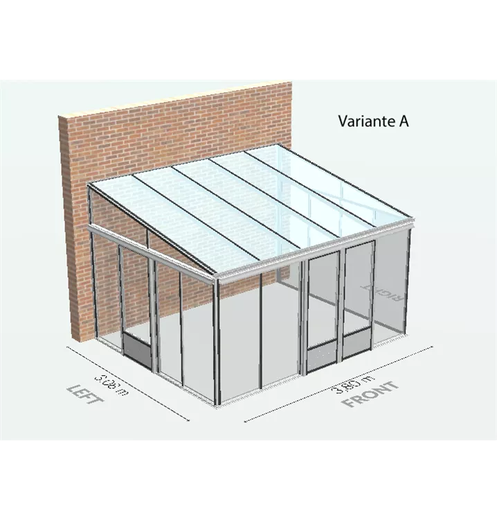 Das Anlehn-Gewächshaus Euro-Veranda ist in der Breite von 2,33 m und 3,08 m und einer Länge von 2,36 m bis 9,02 m konfigurierbar. Es können auf allen Seiten weitere Schiebetüren oder Fenster geplant werden. Fragen Sie uns gerne!
