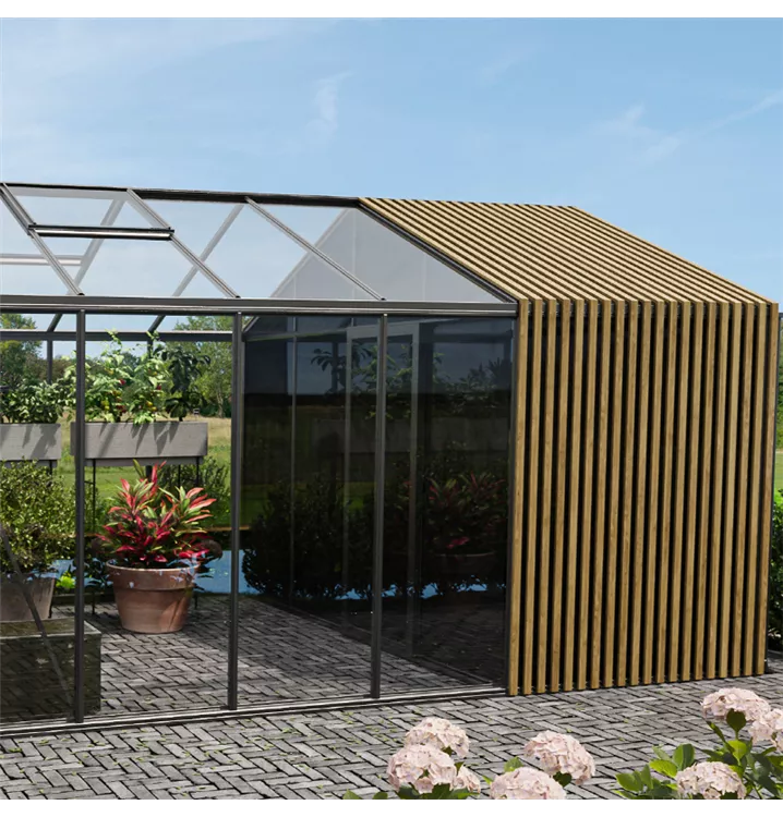 Gewächshaus "Classic Midi mit Lager", Lager mit Glas-Zwischenwand, Lager in getöntem dunklen Glas, Lager mit Accoya Design-Element, 2,35 m Breite (3 Scheiben), Firsthöhe 2,33 m, Seitenwandhöhe 1,77 m, Türhöhe 1,63 m, Durchgangsbreite 0,7 m, Lieferumfang mit je einer Schiebetür außen und innen. Wetterbeständige Konstruktion. Der Bausatz wird mit allen erforderlichen Komponenten, einschließlich Fundamentrahmen auf einer Palette per Spedition geliefert.