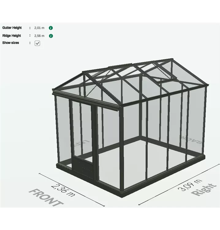 Das Gewächshaus Euro-Maxi ist in der Breite von 2,36 m und 3,09 und der Länge von 2,36 m bis 9,02 m konfigurierbar. Es können auf allen Seiten weitere Schiebetüren oder Fenster geplant werden. Fragen Sie uns gerne!