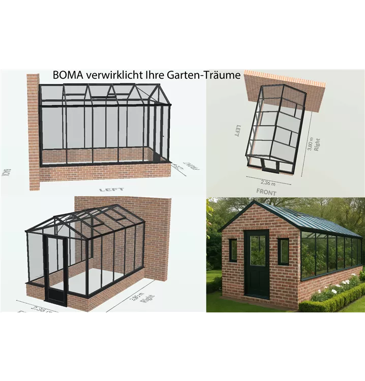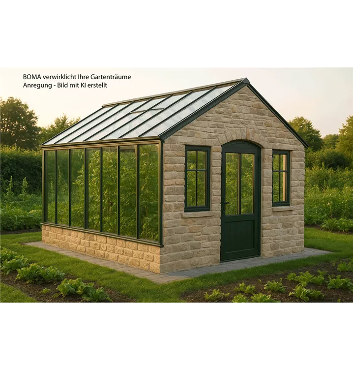 TIPP: Bitte verwenden Sie den Euro-Serre-Konfigurator (Modell Maxi auf Mauer) (in englischer Sprache), wenn Sie weitere Größen oder eine andere Ausstattung wünschen. Alternativ können Sie uns Ihre Wünsche per E-Mail info@boma-gewaechshaus.de mitteilen; wir erstellen Ihnen umgehend ein entsprechendes, unverbindliches Angebot.